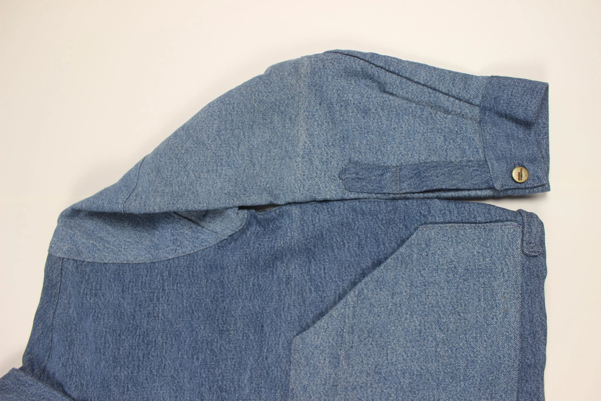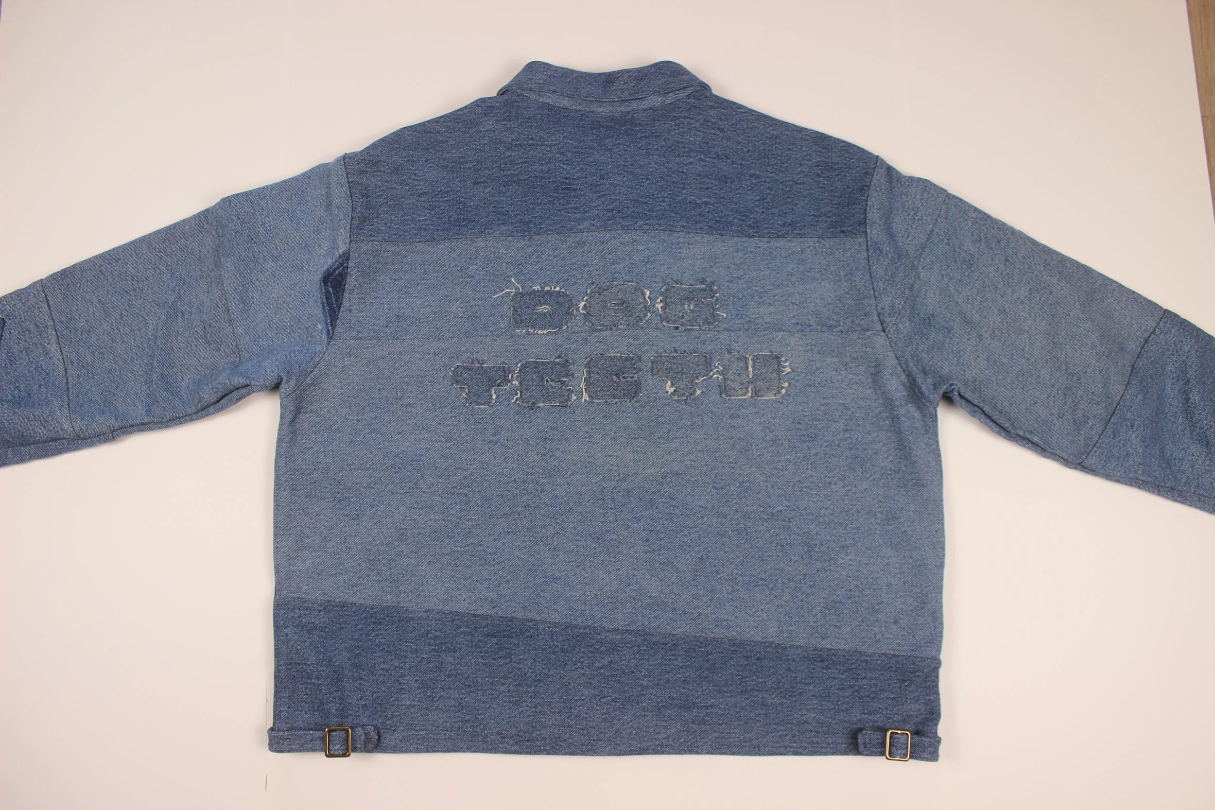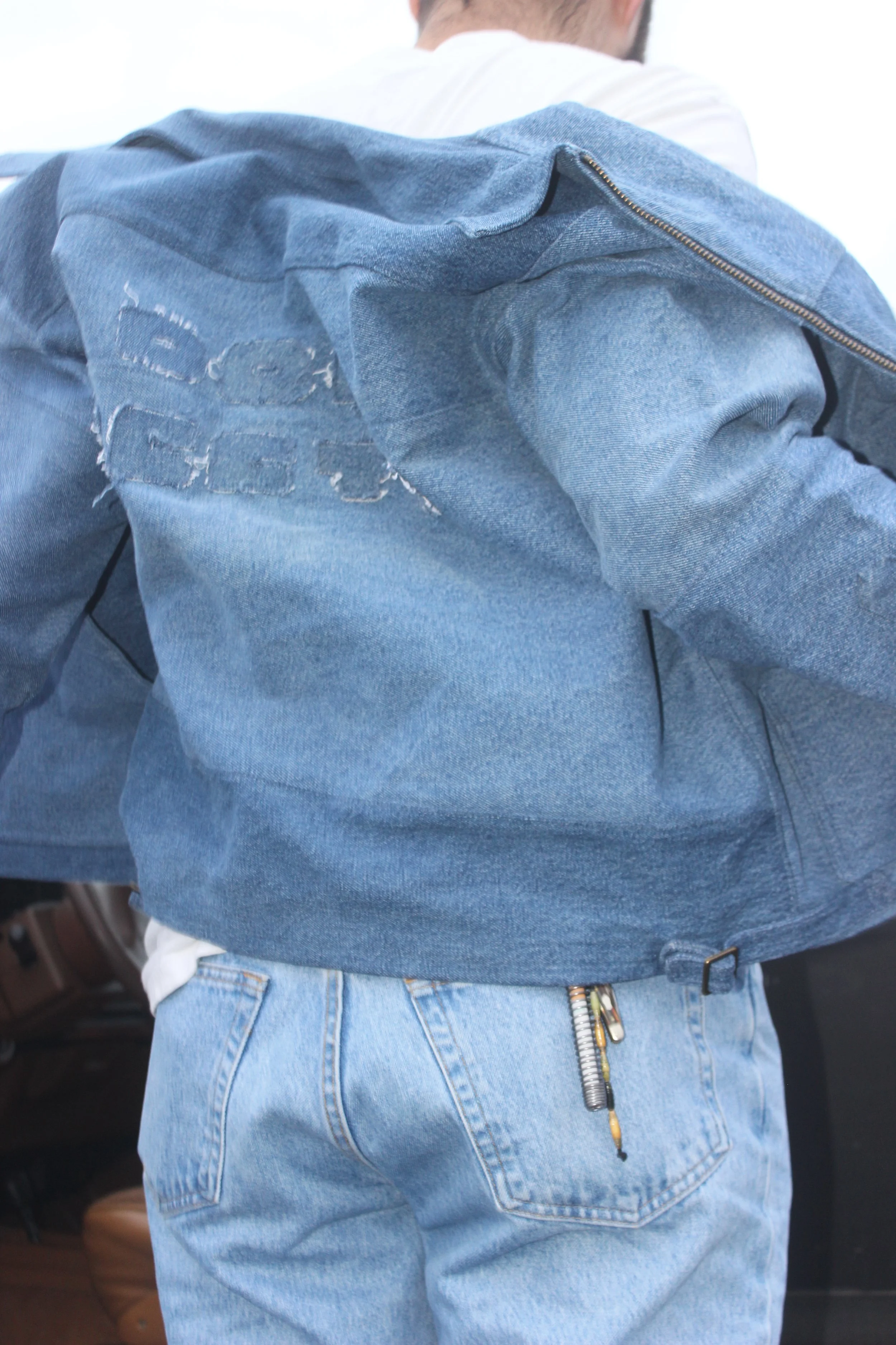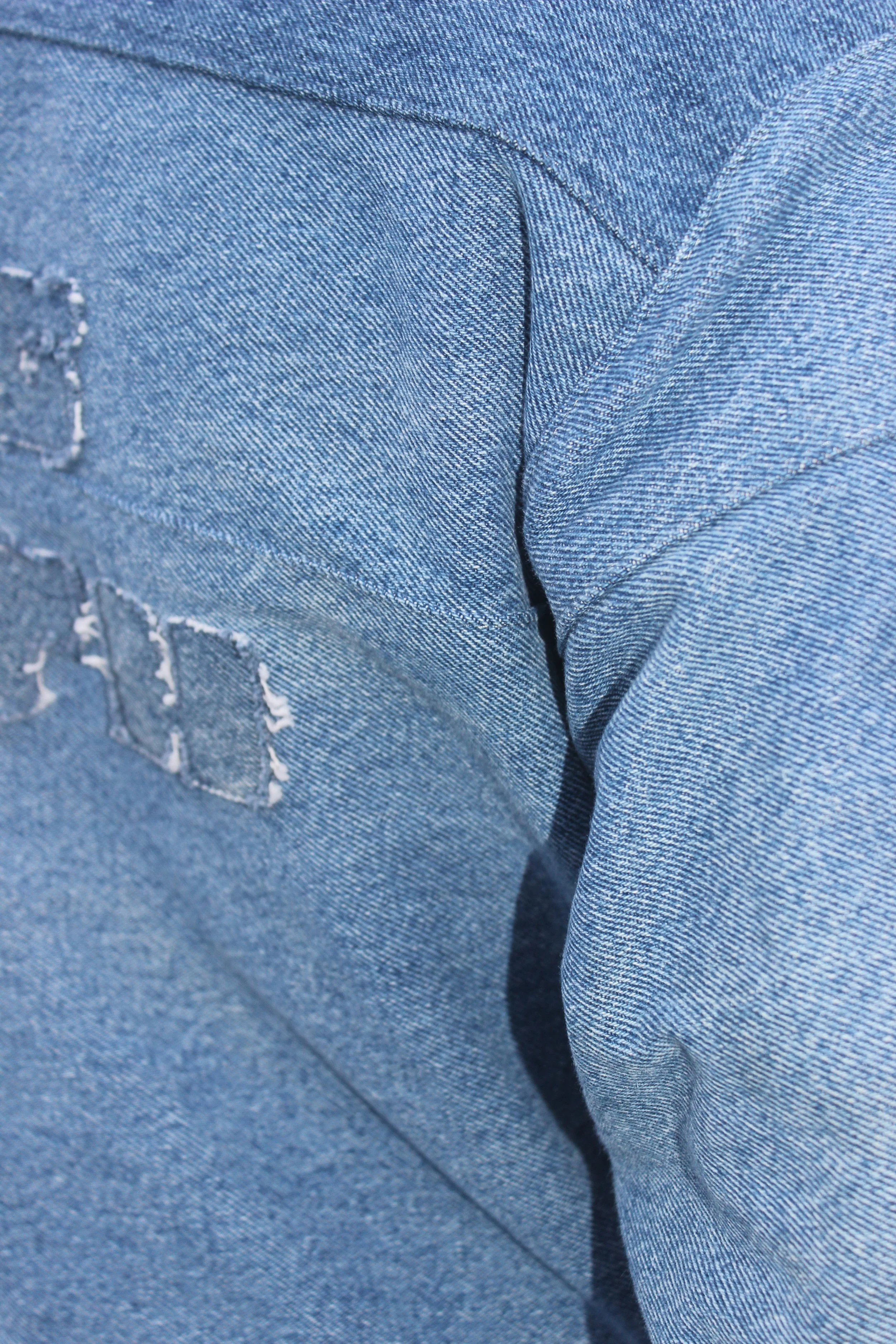 Made from re-worked denim jeans. Buttons and buckles are brass. Cropped for a trucker-type, boxy fit. Letter patches were hand-drawn, cut, then sewn on.