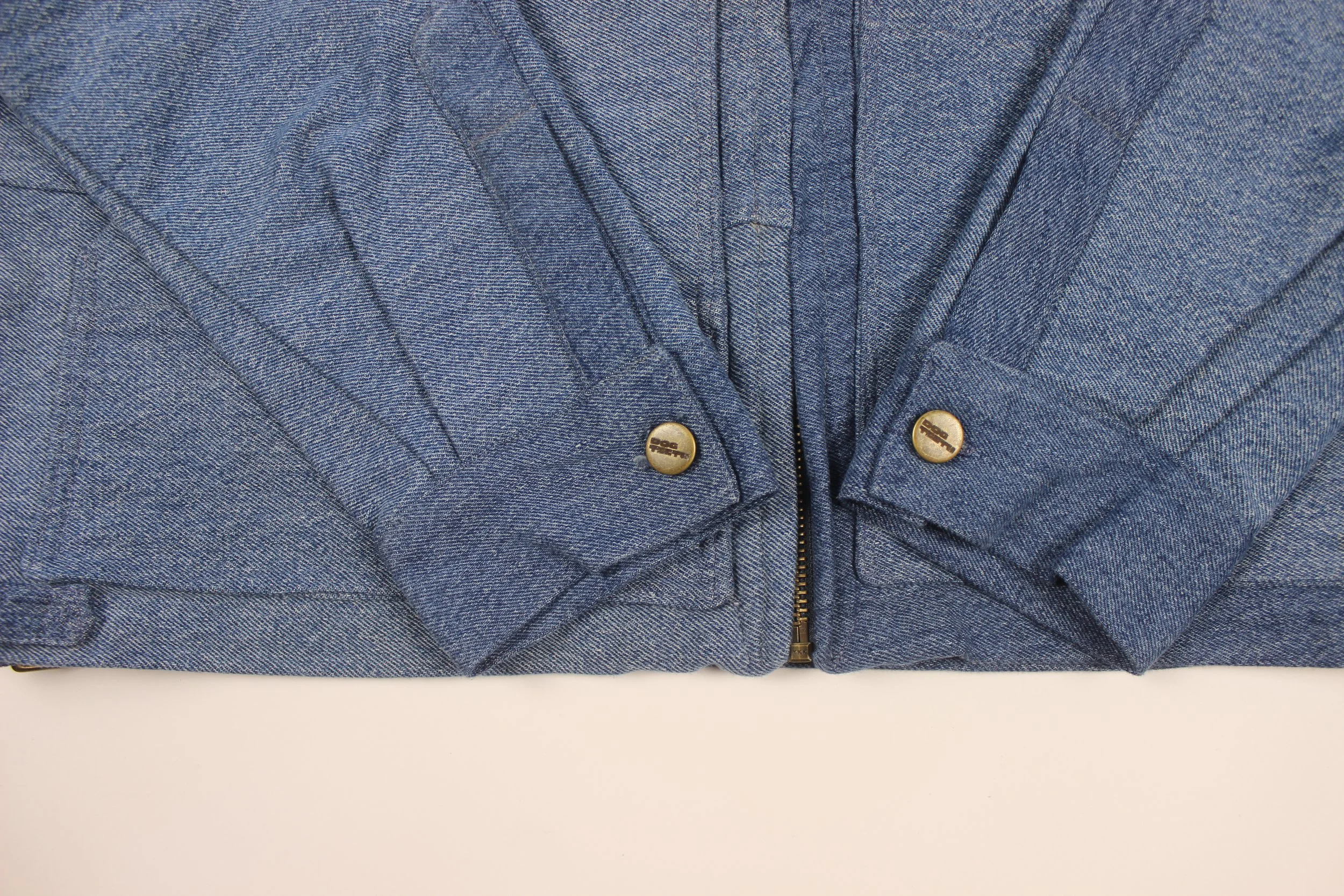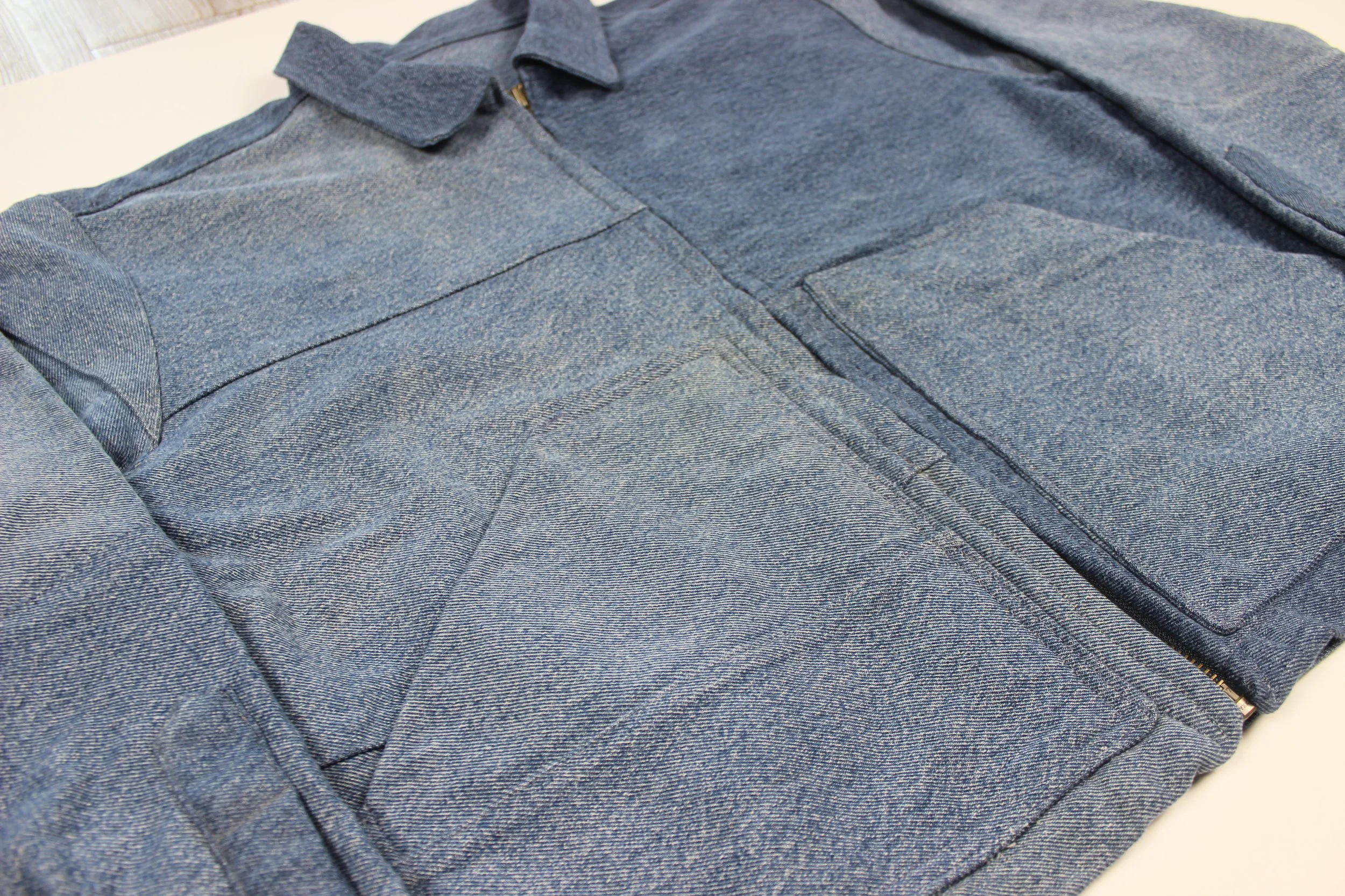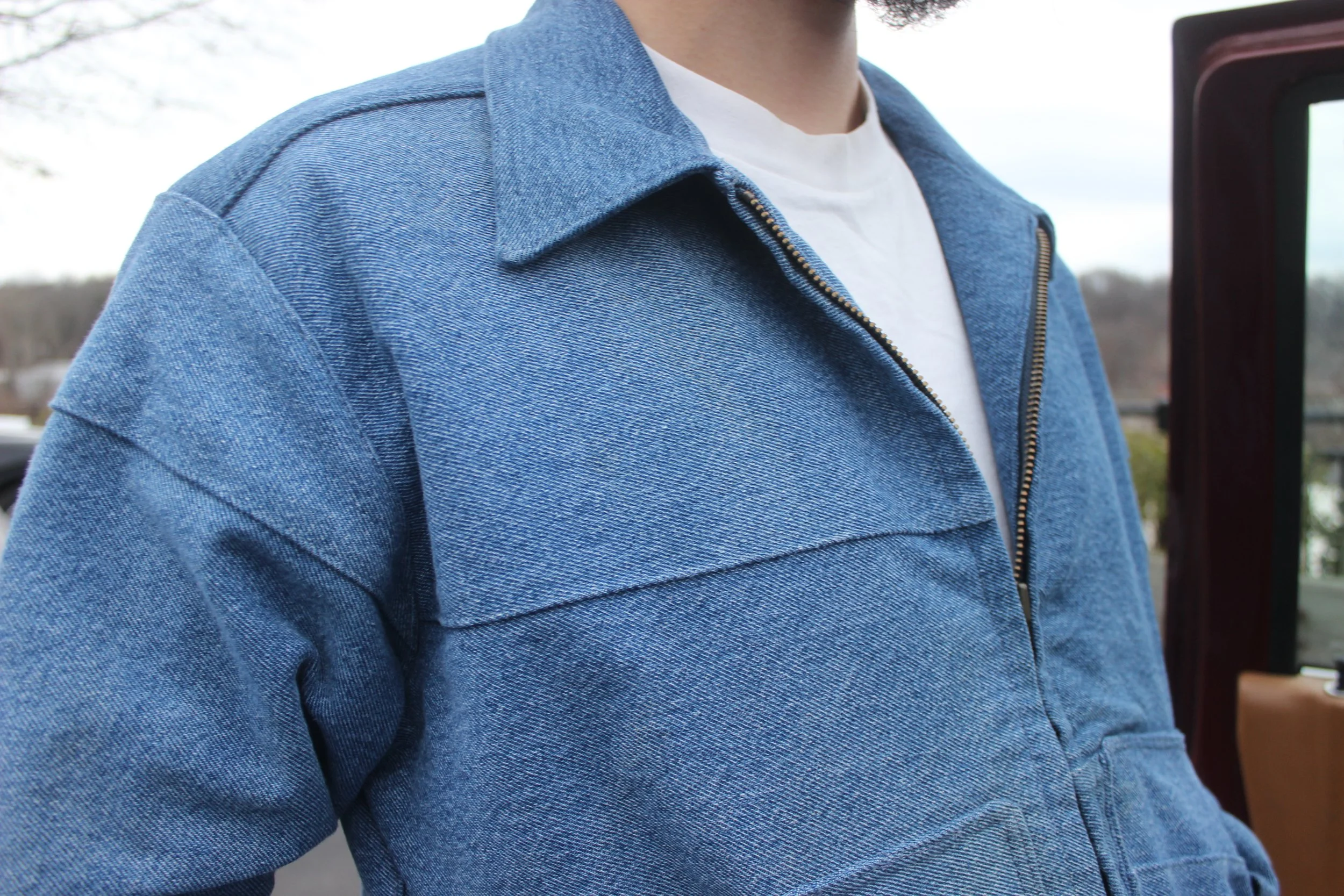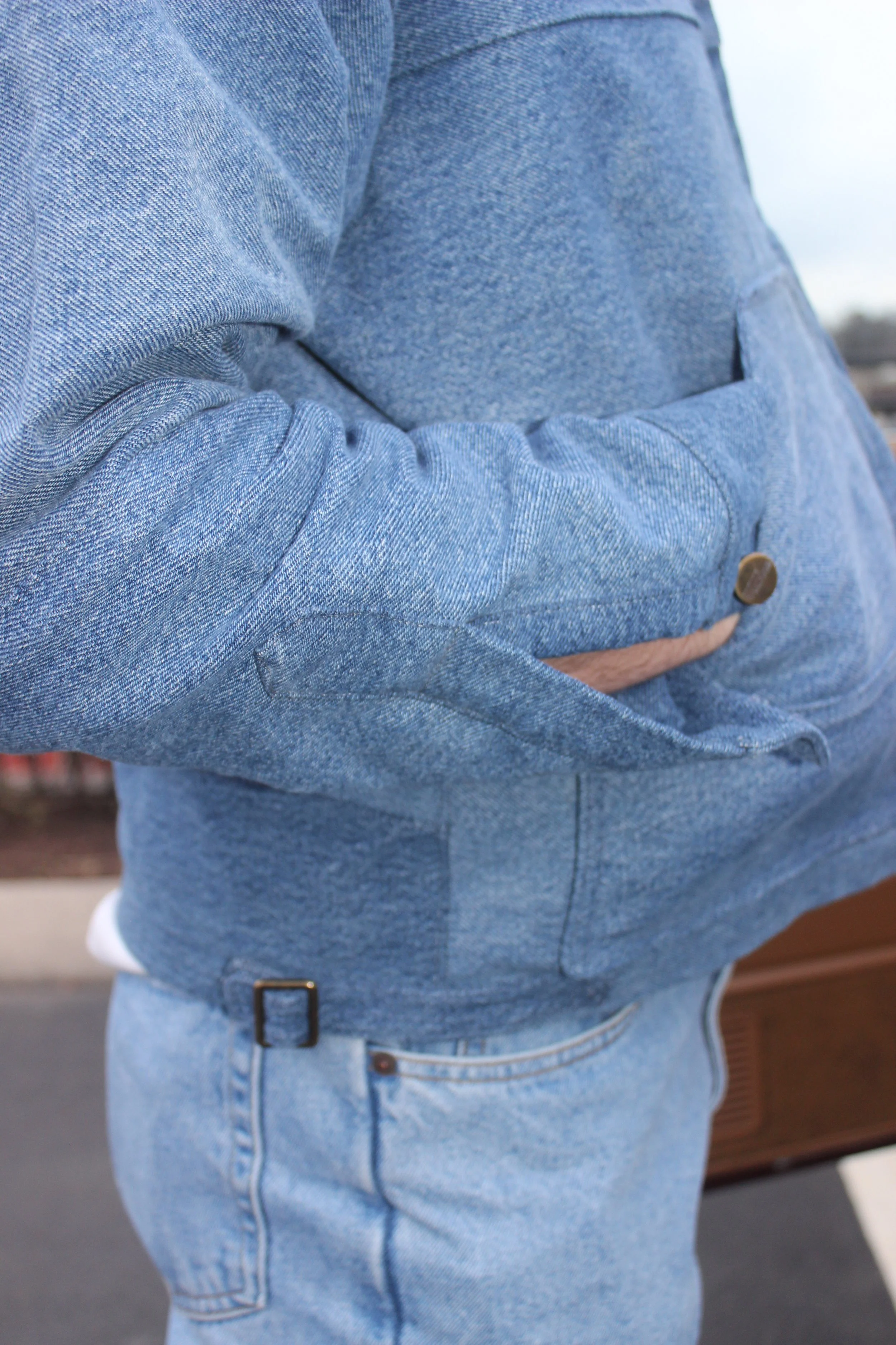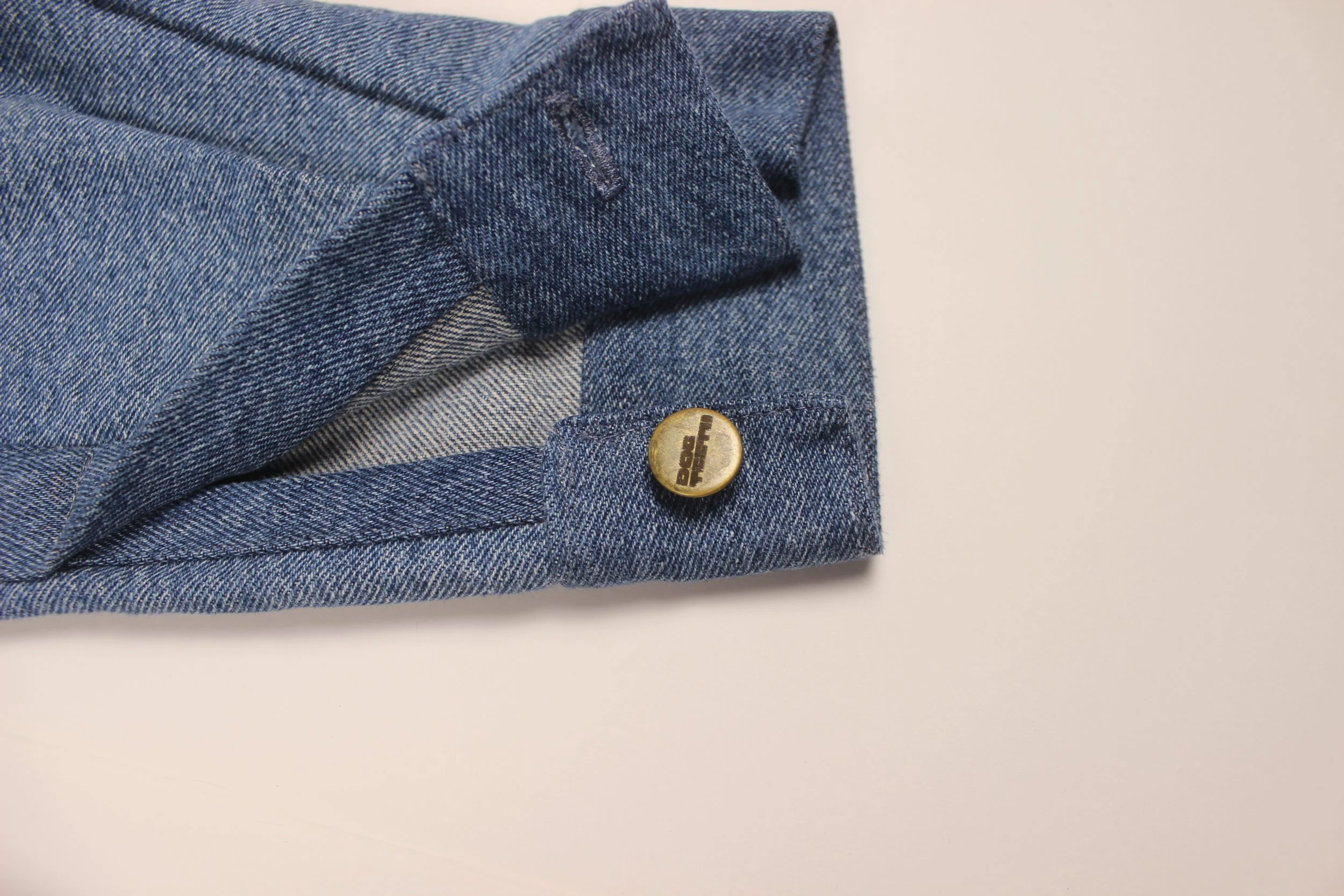 Made from re-worked denim jeans. Buttons and buckles are brass. Cropped for a trucker-type, boxy fit. Letter patches were hand-drawn, cut, then sewn on.