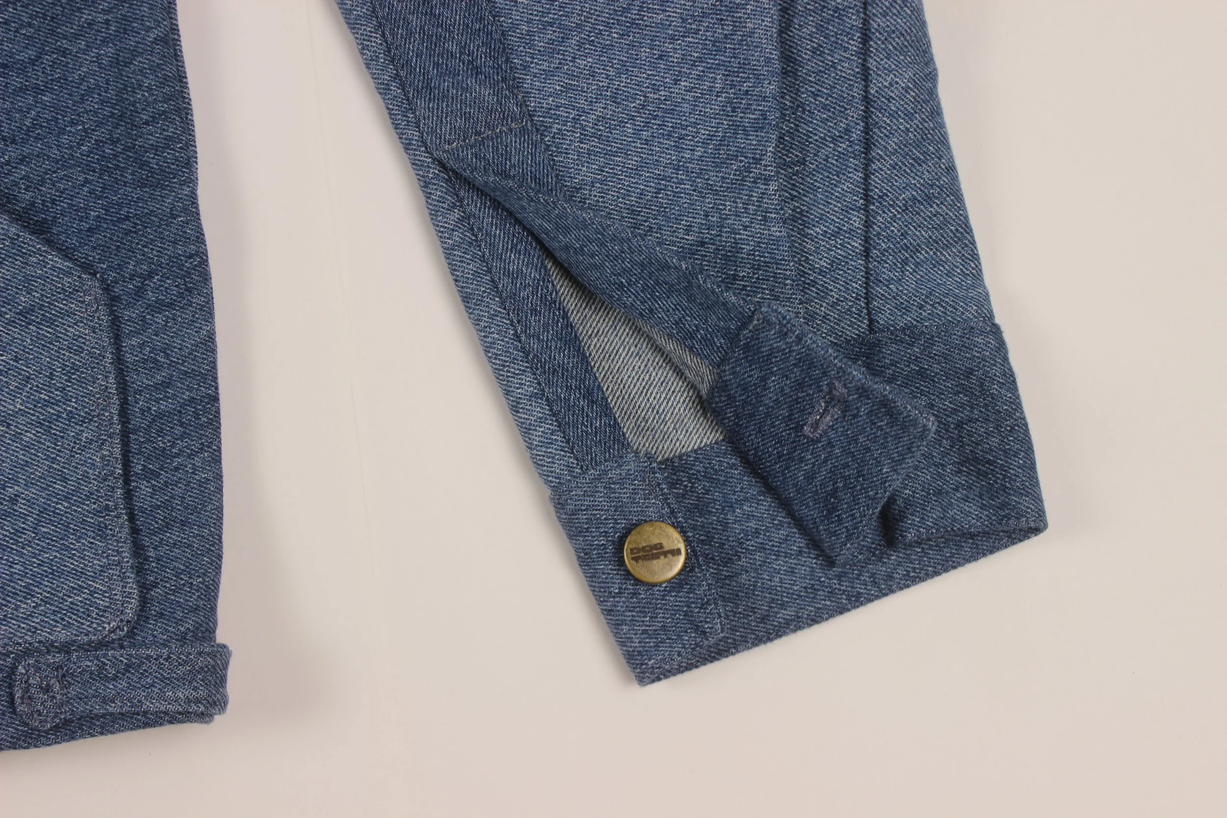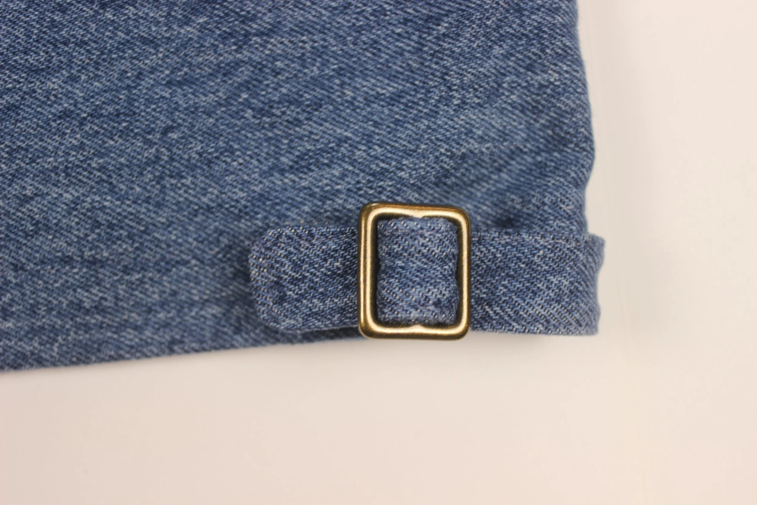 Jackets are made from upcycled denim jeans. Design is inspired by a classic farm chore coat and FFA official dress. Buttons, buckles, and zippers are brass. Cropped for a trucker-type fit.