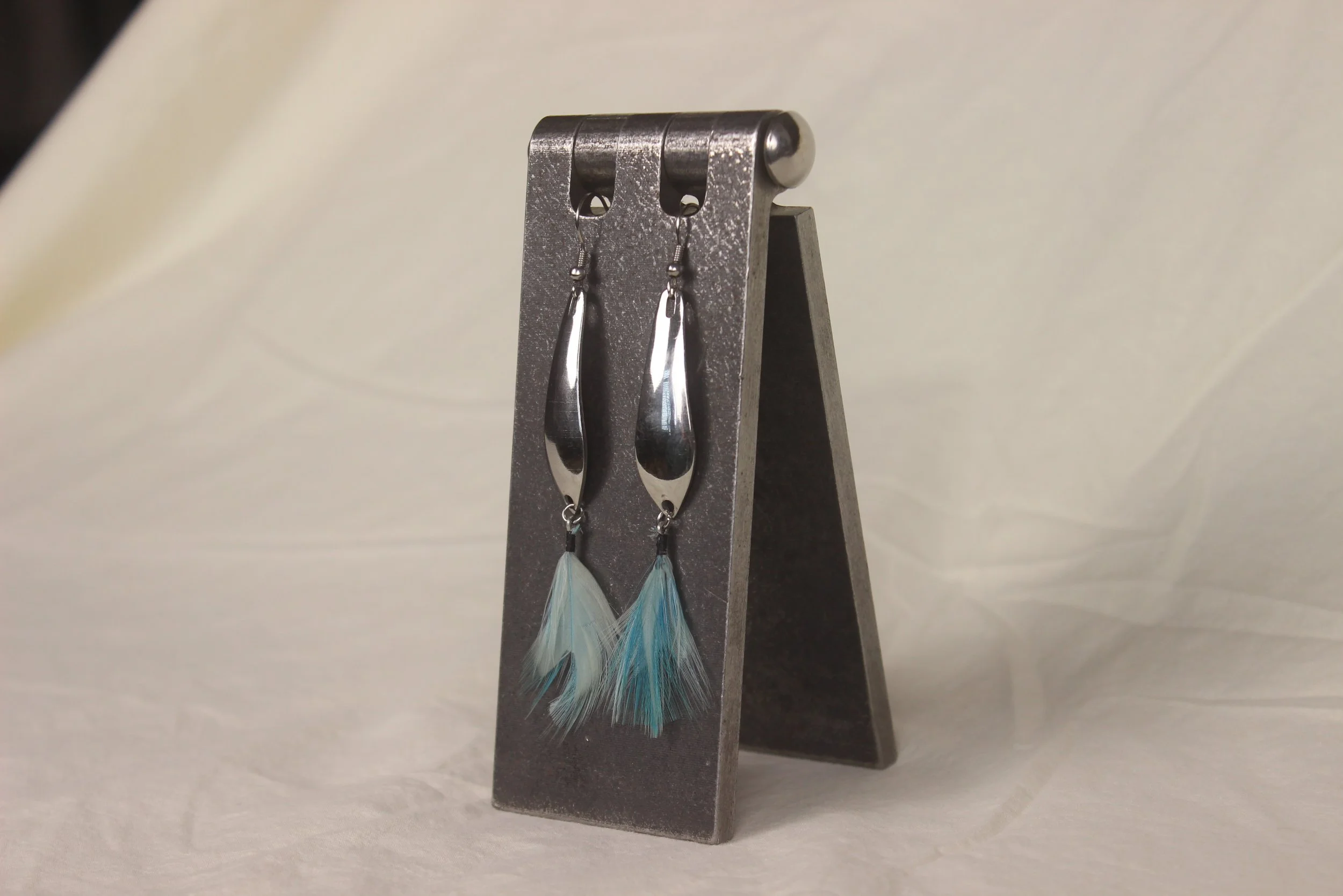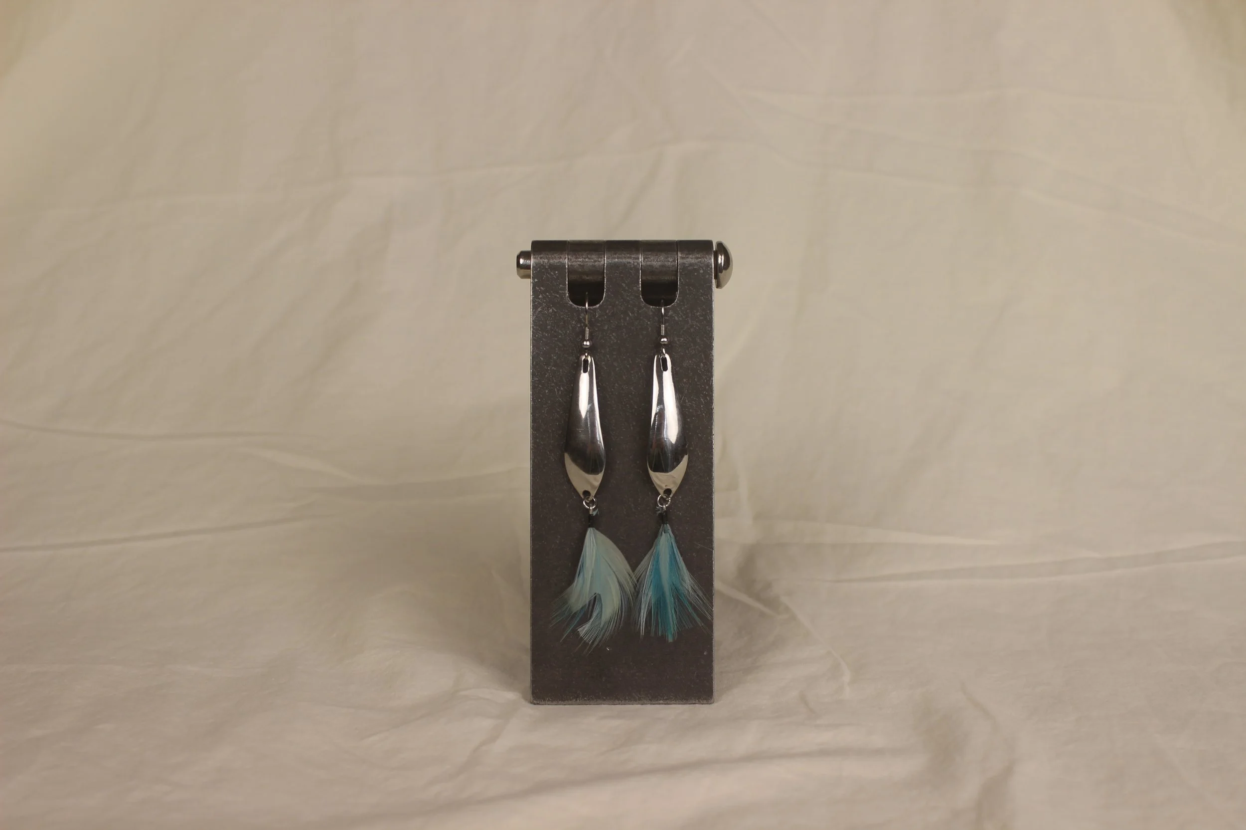Made with secondhand pocket knives and fishing lures. Cleaned and polished, assembled with stainless steel chains, clasps, and earring hooks.
